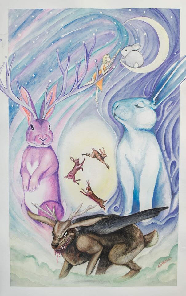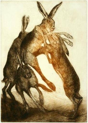 a colony of hares that live with the other rabbits in the warren. They’ve never responded to or given any names, so the rest of the warren just calls them ‘the hares’. Their primary interests, it seems, are concerns of the id: fighting, fleeing, fucking, eating, and the like. They, are, however keenly sensitive to magic, and are drawn to it like watchers of a bonfire. The hares are not especially tame, which makes them a bit chaotic and one-tracked when they front. Inlérah, Breeze, and Wolpertinger all act as sorts of gate keepers and managers for the hares, mostly nudging them towards the internal meadows and fields adjacent to the warren’s burrow and forest. The hares exalt in the Run, the Chase, and the Moon, and can elude even the warren’s guardians, if they are determined to front. They are skittish, though, and they usually disappear as quickly and suddenly as they appear.