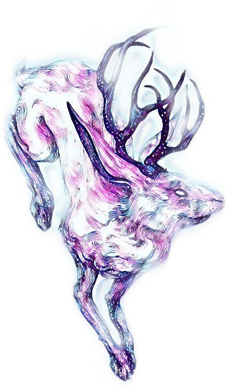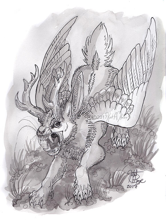 a wolpertinger, typically takes the shape of a hare with antlers, wings, claws, and fangsagelesspronouns and gender are fluid, but she/her and appropriate respect are usually acceptable